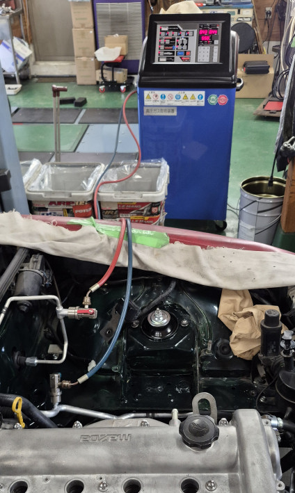 預かりのクルマの作業は終えましたので年内はエラン号に集中です! エアコンガスを注入~ もちろん漏れも無く満タンです!