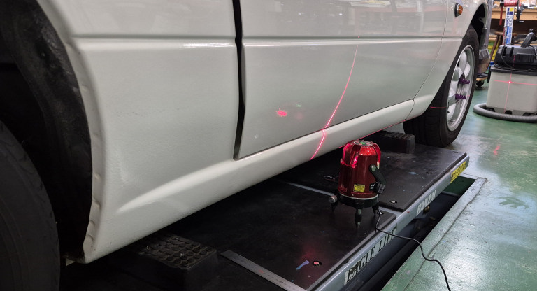 エラン号の簡易アライメントを。足はバラバラにしているのと基準が無いのでとりあえず暫定で。車体の中心線と平行線が作り出せればトーとキャンバーは測れます。キャスターは無理だけど。ジャッキポイントのある「ミミ」を基準にしています、恐らく中心線と平行なんだろうと仮定して。