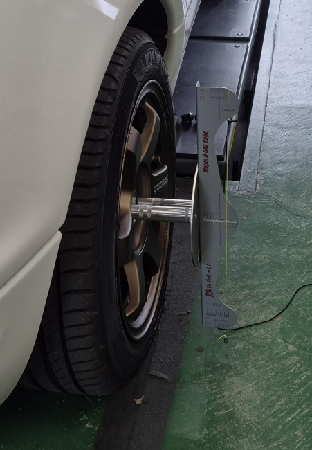 入庫中のクルマ、以前アライメント調整をしているので「定盤なし」でどんな数字が出るのか計測。 目安がわかれば良いので。 とりあえず手直ししたのでオーナーさんに乗ってみてもらって感想を聞こうかな?