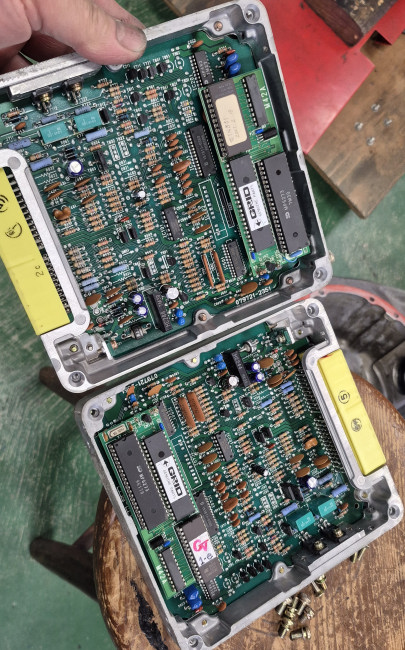 ECUはメンテしてから搭載します。 元々このクルマに装着されていたモノを開けるとロムチューンされてた(笑) 手元にあったウチのステッカのECUのフタを開けるとこれもロムチューン! これは私が昔使っていたヤツですね~