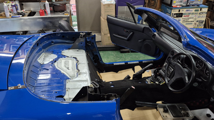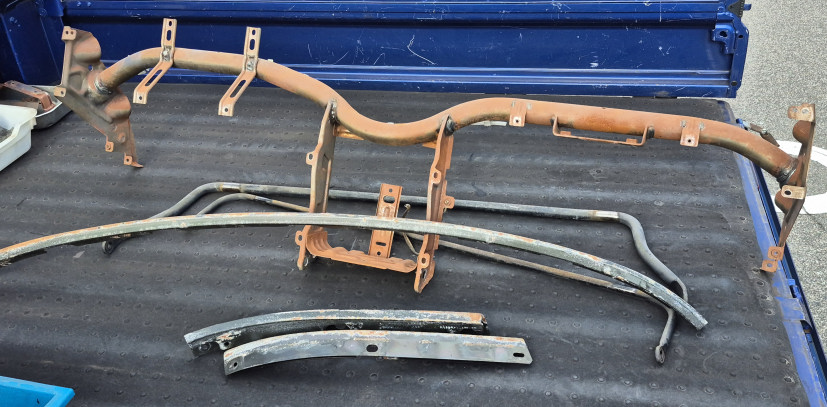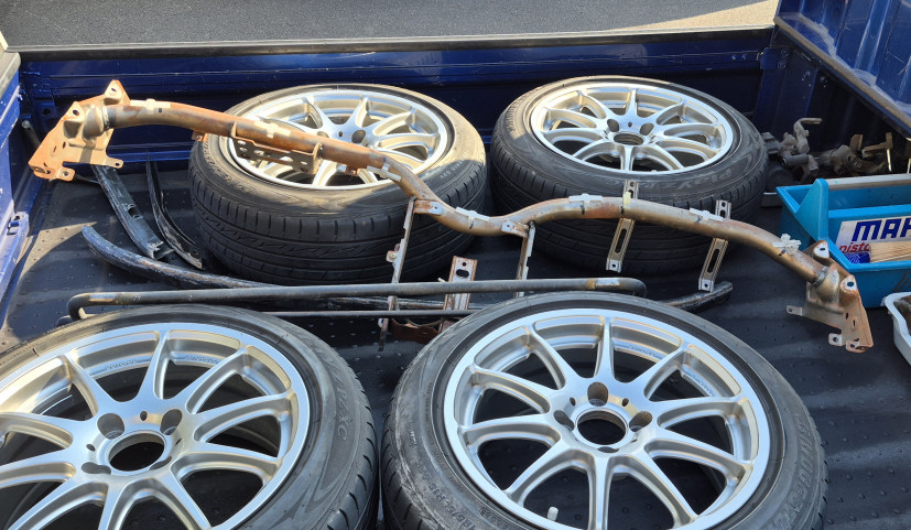 幌のパーツは今、作業中のクルマのモノ。 ダッシュの骨やスタビは2号機のモノ。