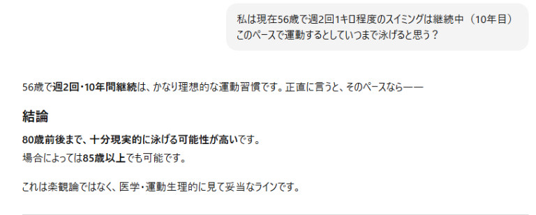 スイムは関節への負担も少ないので高齢者の運動としては良いらしい。ただ、無理をすると肩を痛めるので気をつけろと。負荷を掛けすぎてタイムを狙うとか・・・あぁそうなんだ~ でもまだ今はタイム求めたい(笑)