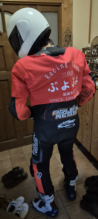 夜、バイクの音が・・・長男坊が不意に帰ってきました。「昭和スタイルを再現するから!」と着替えたのがコレ。