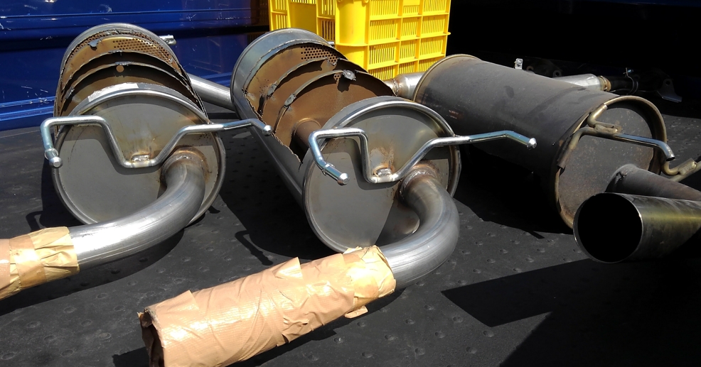 純正改マフラーを作るために昨日届いた純正マフラーの加工をしました。ついでに……先日お客さんが外したマフラーも切ってみようかなと。廃棄処分OKでしたので。
