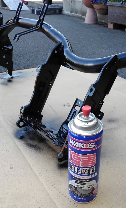 さらに錆止めを吹きます。シャシブラックの高級版です、1本3千円します、普通のシャシブラックは1本千円以下です。