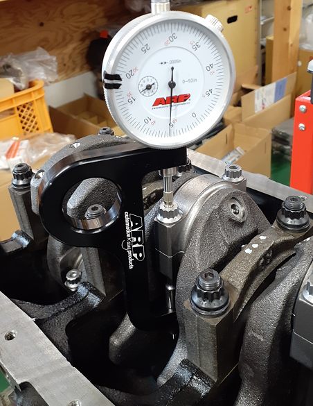 これが締めた後。インチ表示なのですが……0.004-0.006の間が適正値。エンジンに組む前にコンロッド単体で計測しています、どのくらい締めたらどのくらい伸びるのかは。