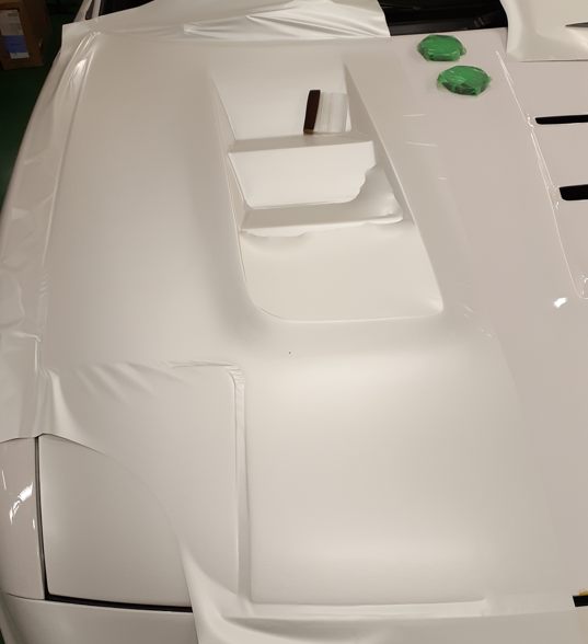 ボンネットをラッピングします。中央付近はラインを入れるので大雑把な形でスタート。エアダクト部分はシートを温めながら伸ばして張り込みます。多分……そのうち浮き上がりそう(笑) そしたらこのダクト部分だけ張り直そうかなと。そういうことが出来るのがラッピングの利点のひとつかと。塗装の塗り直しは大変ですがラッピングの一部貼り直しは簡単なんですよ。