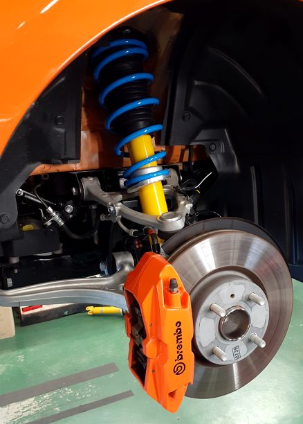 将来ブレンボキャリパーを入れるために今のレイズのホイルを買ったんですよね、ZE40の16インチでブレンボと干渉しないのは私の買ったサイズのみ。実はこのオレンジにも同じホイルを装着しています。オレンジは元々ZE40ですけどね(笑) 今回のサスキット交換に合わせて同時交換でした。
