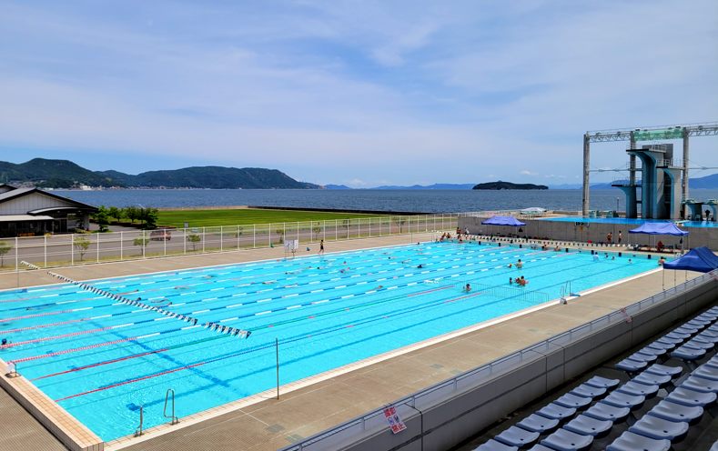 ここは屋内に25Mプール(通年使用)と夏季限定で屋外に50Mプールがあります。ご覧の通り瀬戸内海がすぐそこ。最高のロケーションです。