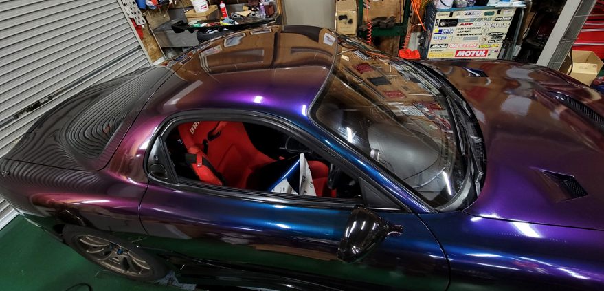 ボディが黒いクルマにラッピングしたかったんですよ、手抜きができるから! どういうことかと言えば貼り残しがあっても黒だと目立たないでしょ? 白のRFにこの色を貼るのがどんだけ大変だったか。少しでも白いのが見えたらカッコ悪いしね。