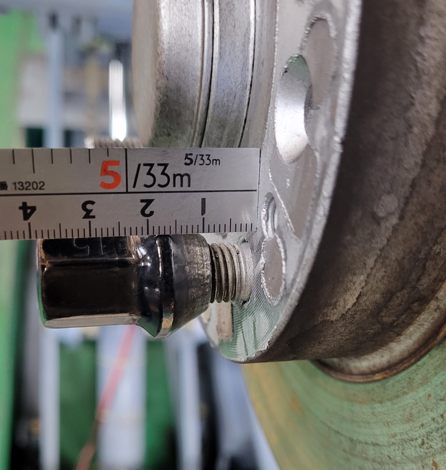 ホイールの厚みが8ミリくらいです。差し引くと17ミリですよね、これがナットの掛かり代。仮に5ミリのスペーサーを使うとナットの掛かり代が5ミリ減りますよね? 17ミリから12ミリへ。