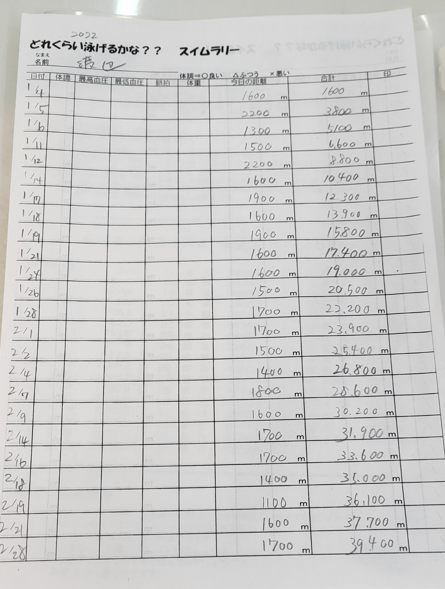 今年から泳いだ距離を記録しています。今日で2か月終了、40キロ弱ですか。自転車なら1回乗るとクリアできる距離ですな~ 競泳している子供達は1日5キロとかもっと泳ぐんでしょ?凄いなぁ~ 50過ぎのオジサンはこれでもシンドイのだよ……