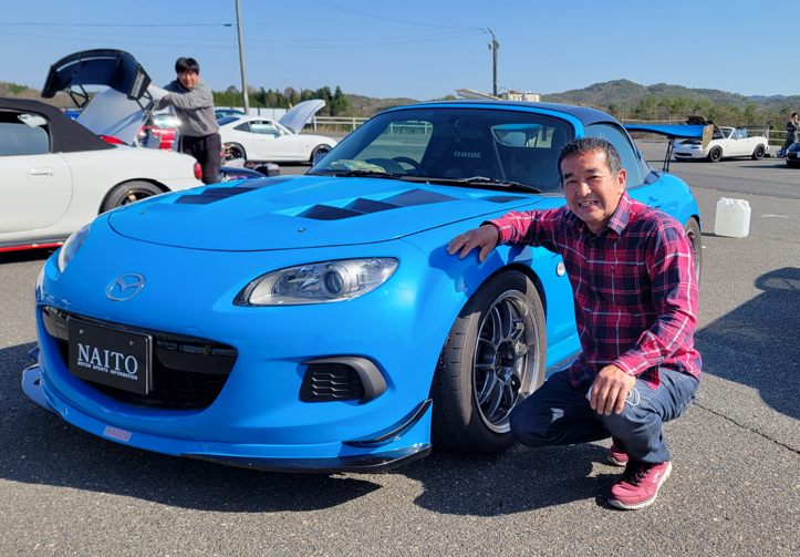 初出店の松元エンジニアリングさん、この写真で人柄がわかるでしょ!(微笑) ほんと、イイヒトです。左のメカさんも凄く真面目な人。九州のロドスタ乗りの方でメンテのお店を探しているヒト、お勧めです。