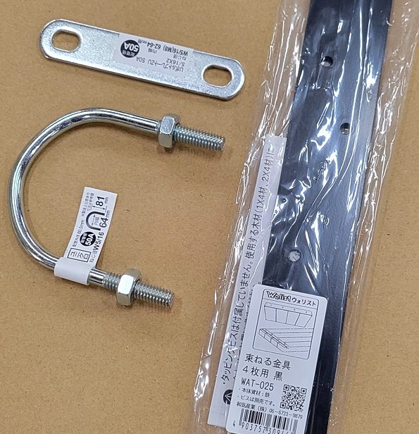 今日の夕方、ホームセンターで買いました(笑) 64ミリのU字型の金具、30センチくらいの鉄の平板です。生の鉄(フラットバー)を買えば安いのですが猛烈に錆びるので塗装済みをチョイス。全部で500円未満です。参考までに。
