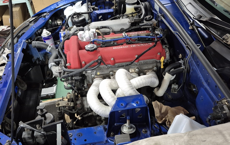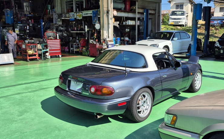 ガレージでは2台が同時進行で作業中~ このNBはエアコンを新調します。スペシャルエキマニが装着されていますがエアコン部品の脱着は可能です。