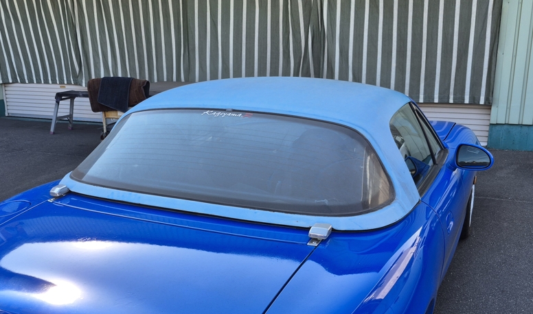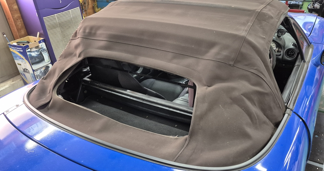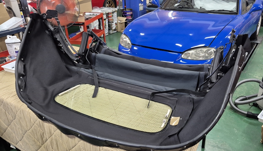 幌のガラスが落ちたと(笑) さすがにコレは……本来であれば10月にならないと作業時間は確保できなかったのですが部品待ちで作業が延期になった案件があり、しかも幌は在庫しているという。純正幌を在庫しているお店がどれだけあるかな? ほぼ無いんじゃない?(微笑)