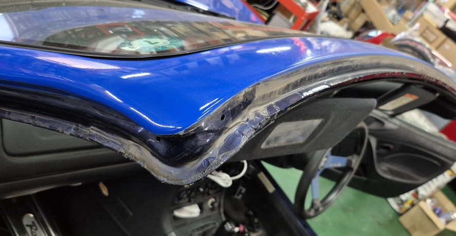 当店は幌交換と同時に2つ追加作業を行います。一つ目はこのベルトラインモールの交換。モールを取り外すと古いブチルゴムがこのように残ります、これは掃除します。