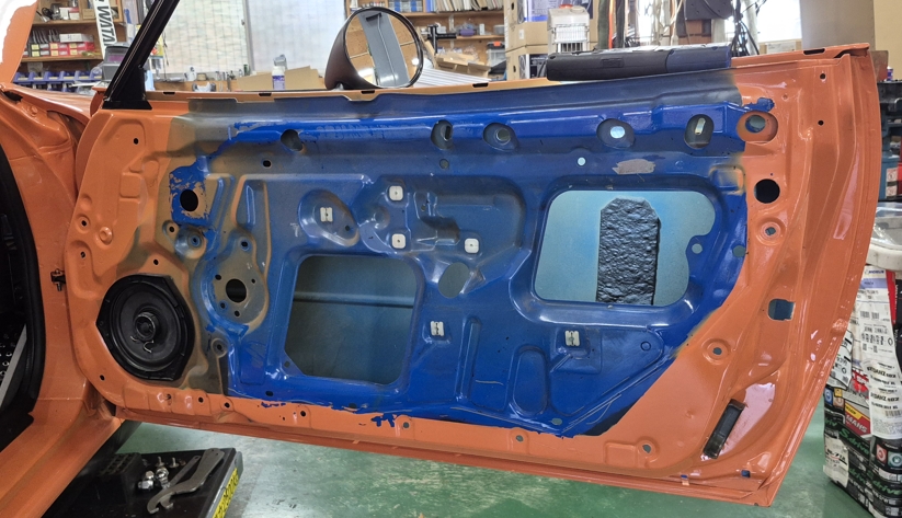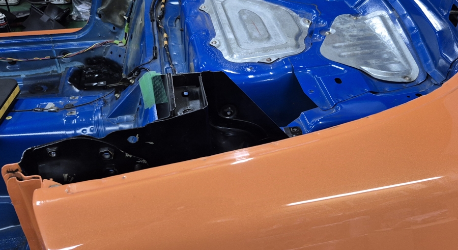 このクルマは元々マリナーブルーでオレンジ色に全塗装してあります。ベルトラインモールも外して塗っているのはナイスですね。手間が掛かっている全塗装だと思います。仕上がりもキレイだし。