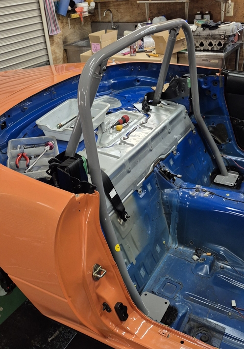 メインアーチはまだ床に固定しません。ドーダバーとか内装を固定してから……シートベルトも新調したので先にセット。ロールバーがあると入らないので。つまり組付ける順番を考えないとダメってことね。
