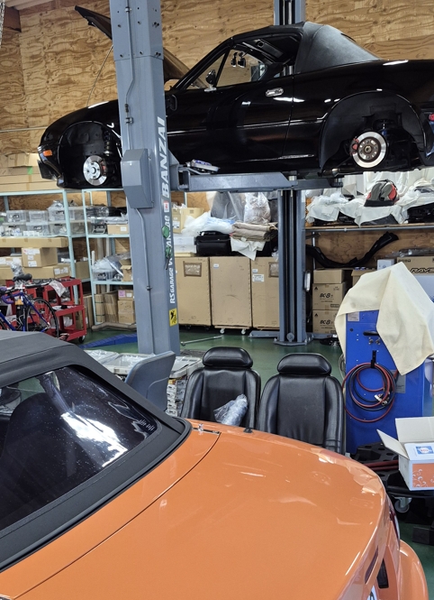 オレンジなNAの作業中ですが……室内側でやることはいくつかあって……作業の順番を考えつつ……幌を降ろしました。幌交換もあるので。