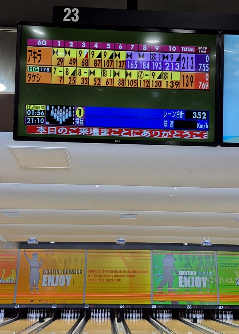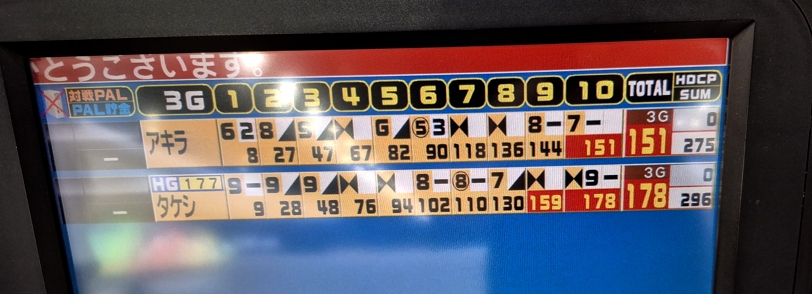 「タケシ」の名前の上に「HG177」とありますがこれが過去ベスト、このボーリング場の会員になると自己ベストが表示されるのです。 本日、半年ブリくらいに更新、178ですが(笑) たった1ピン~
