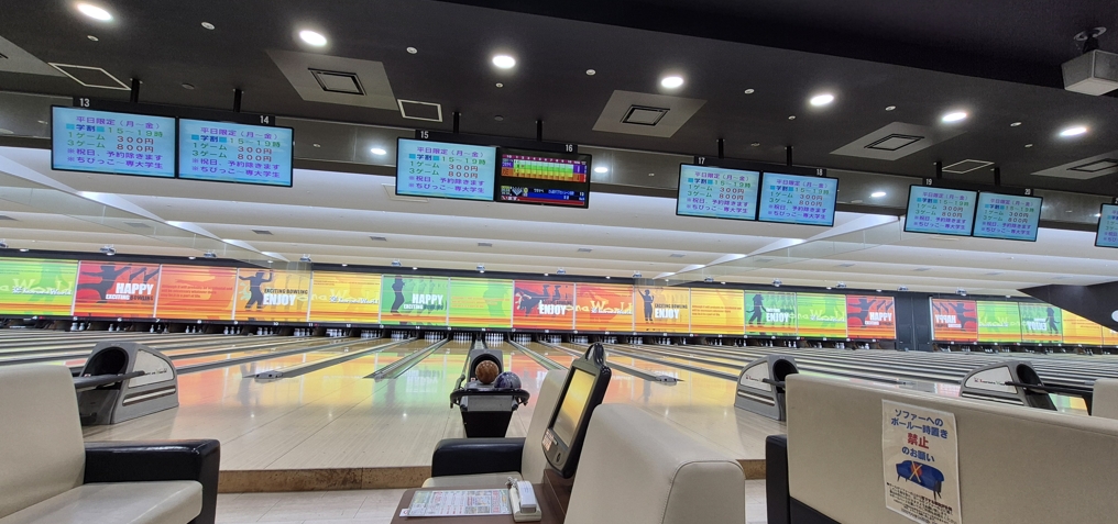 水曜の夜は空いているらしく……2レーン貸してくれました。1フレームごとにレーンをチェンジするアメリカン方式で投げることに!