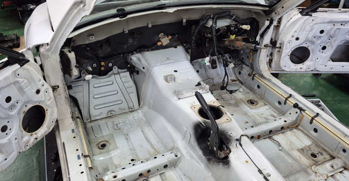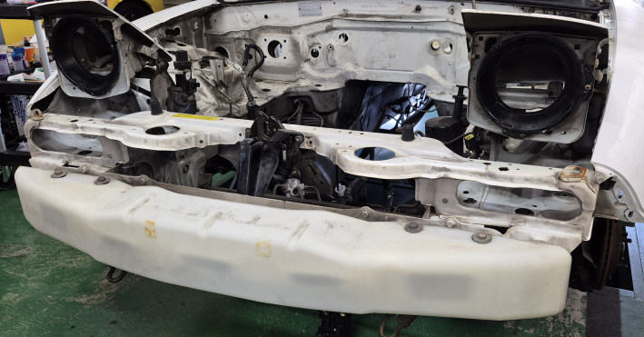 フロントバンパーは別のモノに交換します。この絵を見て……わかる人はわかるでしょ、事故してないフロント廻りということが。フェンダの先端とか、コンビレンズが付く辺りが歪んでいるクルマが多いんですよ。これはシッカリしてます。 見た目はポンコツですがシャシはしっかりしてるんです、こういうのが化けるんですよ♪