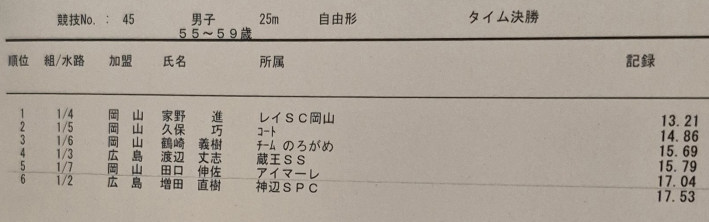 12時過ぎにまずは25Mの自由形(クロール)から。更衣室で屈伸はした、いじょ(笑) 水に全く入らずにいきなり本番か~ 緊張するな~ と言うことでスタート! 25Mのクロールは息継ぎしません、耐えるのです。